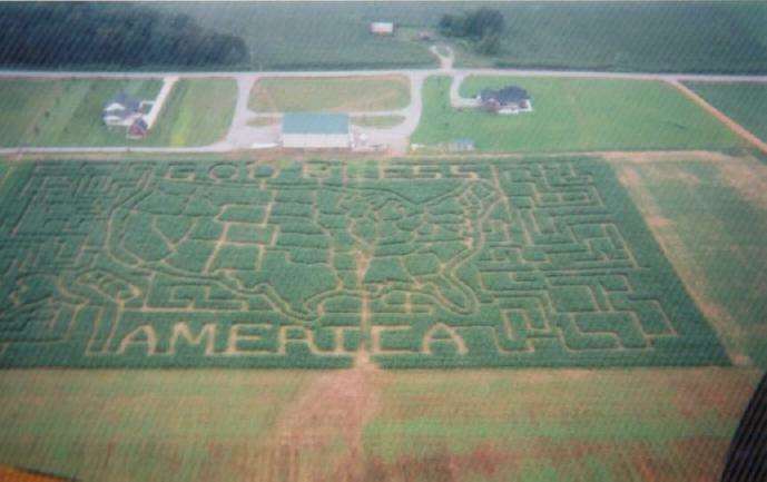 Jon Rose of Lawrenceburg, Tennessee, created a maize maze on his farm in 2002. Jon made a giant labyrinth based on a map of the USA (with Alaska and Hawaii), bordered above and below it with the phrase "God Bless America". |