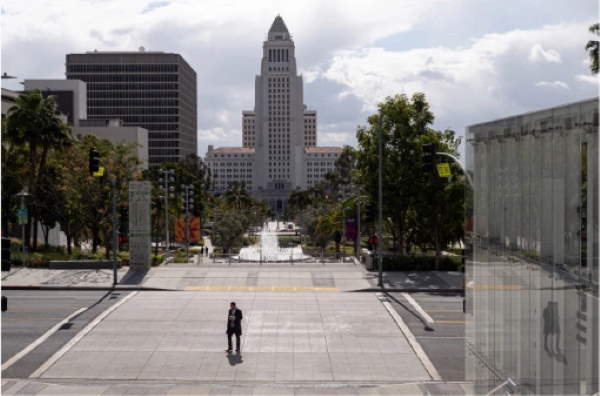 A lone pedestrian crosses Grand Avenue with Los Angeles city hall as a backdrop