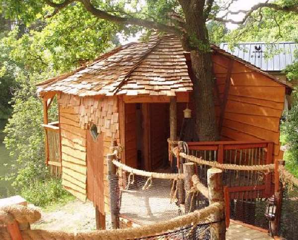 The hotel features four miles of walkways and a honeymoon suite, 110 feet up a mahogany tree.