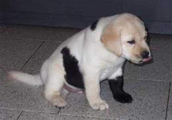 These Labrador Retrievers have a somatic mutation, which causes yellow labs to show black spots. This mutation is not inherited or passed on to the offspring.