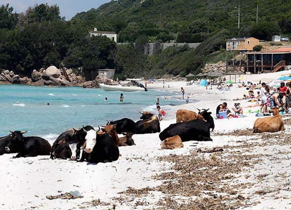 On a beach near St. Florent on the French island of Corsica, cows and beach